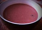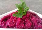 Zupa krem z burakow czerwonych, pierozki (mini) z kiszoną kapustą i grzybami polane zrumienioną cebulką.
