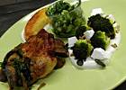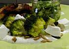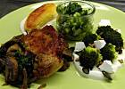 Cd...Pieczony schab-bekon,podany z duszonymi pieczarkami ze szpinakiem...salsa z zielonych ogórków...brokuł z fetą,sosem czosnkowym i uprażonymi pestkami...pieczony,młody ziemniak podany na sosie czosnkowym
