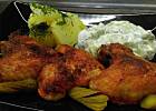 Karczek pieczony w plastrach,ziemniaki,mizeria a ja mialam surowke z pora i jablka z jogurtem.