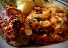 Pieczone zrazy z mielonego miesa nadziewane pieczarkami i mozarella, bigos z mlodej kapusty i ziemniaki z koperkiem.