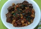 Wołowinę kroisz w większą kostkę, obsmażasz ją na patelni, żeby była ładnie przyrumieniona z każdej strony, wrzucasz do sporego gara. Na tej samej patelni szklisz cebulę pokrojona w piórka, z dodatkiem rozgniecionego czosnku, dodajesz do mięska, podlewasz wodą (ok. pół szklanki) i pomidorami z puszki. Dodajesz mieszankę przypraw i łyżeczkę soli. Dusisz na małym ogniu do momentu, kiedy mięso będzie miękkie, co jakiś czas podlewając je wodą. Dorzucasz ugotowaną ciecierzycę i gotujesz przez kolejne 15 minut. Na koniec posypujesz natką pietruszki lub kolendry. Mięso i ciecierzyca ma być tylko oblepione sosem a nie w nim pływać:)