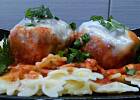 Zapiekane w sosie pomidorowym "miseczki z mielonego mięsa,z nadzieniem...mięso i sos doprawione ziołami trnsylwańskimi i harissą...nadzienie to pomidory,szczypior i papryka...pod koniec pieczenia plastry mozzrelli...pieczone na turbo grillu w 190 stopniach ok godziny.