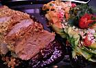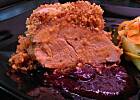 Dziś podałam obiad na pikantnie ... Pieczona polędwiczka wieprzowa z chrupiącą kruszonką (miks orzechów,parmezan,prażona cebula,bułka tarta,masło,ostra papryka,suszona natka pietruszki,sól),podana na pikantnym sosie żurawinowym (suszone owoce żurawiny,brązowy cukier,sok z mandarynki i cytryny,ocet winny z ziołami,chili,cynamon i odrobina imbiru) ... Tagliatelle z cukinii i marchewki,z chili,czosnkiem,natką pietruszki,parmezanem i orzechami ;)