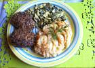 kotlety z pozostałej kaszy jęczmiennej z sosem grzybowym,ziemniaki, cukinia z papryką na ciepło,
