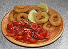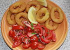 Dzisiaj Kalmary w cieście z surówką z pomidorów:))