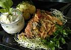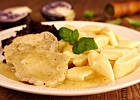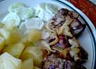 karkówka w sosie x 5, młode ziemniaczki z koperkiem i mizeria.