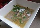 Z racji powrotu zimy postanowiono przetestować dwie nowe knajpki w okolicy. Niby zwykła smażalnia ryb (z własnego stawu), a rybka super - hiper - odlotowa. Frytki pyyyycha, przy mnie, z wybranego ziemniaka, robione i małosolny ,na wpól-ukiszony ( też sama sobie wybrałam). Niby wielce rozreklamowana Karczma Kamienna, z tradycjami od 1780r, odwiedzana przez samego Goethe (go?), a jedzenie hiper - liper - duper. Schab na kapuście wytaplany i chyba moczony w tłuszczu. Zwykły panierowany zaparzony z odłażącą panierką , brrr (że nie wspomnę o obsłudze i marazmie). Rekompensata w domku; zupa mocno pieczarkowa z serkmi topionymi i zacierką, moja chińszczyzna, a z pozostałej wołowinki gulasz z pęczakiem na jutro.