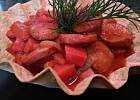 Barszcz ukraiński, kurczak pieczony w całości, młode ziemniaki z koprem i ogórki małosolne.