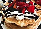 Gofry. Domowe sosy czekoladowy i truskawkowy, bita śmietana, owoce.