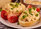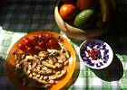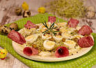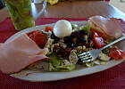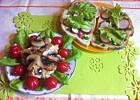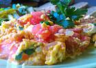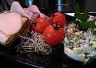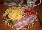 jajecznica, baleron własnej produkcji, sałatka z pomidorów ...