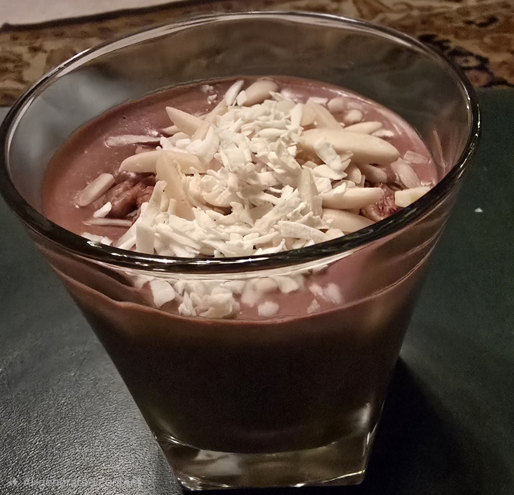Czekolada lub chipsy czekoladowe o dowolnym stężeniu kakao (180 g), do tego tlusty ser, u mnie ricotta i philadelphia (425 i 230), coś 150 - 250 śmietanki kremówki (tu muszę dopracować, 150 może być mało, bo zwarte po nocy w lodówce wyszło), jakieś jakieś 60 g masła, coś do posłodzenia, u mnie 5 łyżek- za dużo, stąd philadelphia dodana. Czekoladę, masło i śmietankę rozpuścić w kąpieli wodnej. Jak się połączą wtedy dodać ser, dalej na parze, zmiksować mikserem (najprościej) aż wszystko uzyska aksamitna konsystencję. Do pucharków z czymś chrupiącym pomiędzy (albo nie), z orzechami i owocami na wierzchu. 4 szklanki do wina mi wyszły. Jutro Wam pokażę, bo dziś telefon na uwięzi.