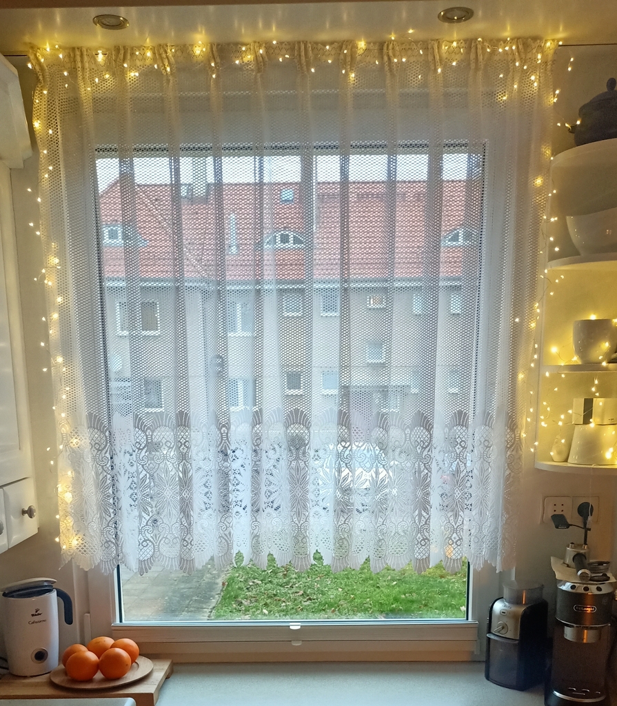 A! Upięłam lampki na firance. Zrobiło się nastrojowo.