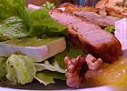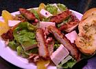 Obiad z serii"sprzątanie lodówki"...sałata,filety z pomarańczy,paski z kotleta schabowego,ser brie,orzechy włoskie i laskowe...sos składa się z kremu balsamicznego,soku z pomarańczy i cytryny,czosnku,chili i soli...do tego grzanki czosnkowe ...mniam :)