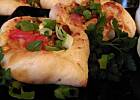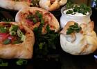 ...łódeczki z ciasta drożdżowego z nadzieniem mięsno-warzywnym...nadzienie składa się z szynki wieprzowej,pieczarek,cebuli,kukurydzy,papryki,sera żółtego,przyprawione mieszanką do gyrosa z czosnkiem(nie kebab-gyros!!!)...ciasto z dodatkiem chili,czosnku i oregano...z pozostałego farszu sakiewki z ciasta francuskiego...do tego sos czosnkowo-szczypiorkowy