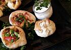 Grillowane warzywa ( papryka, cebula, pieczarki i cukinia), hummus i chlebki naan z patelni.