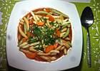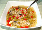To rosół z drobiu, pokrojone mięso z kurczaka, makaron, papryka i groszek. Przyprawione na ostro (ostrą papryką) :)