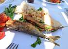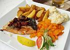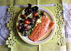 Pstrąg łososiowy grillowany, miks sałat z sosem vinegrette oraz pomidorkami truskawkowymi, winogronami i czarnymi oliwkami :-)