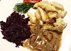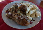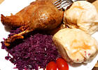 Kaczka z pyzami i modrą kapustą.