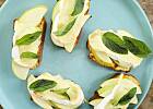 A na śniadanie kanapki zapiekane, z zielonym jabłkiem, serem pleśniowym i miętą.