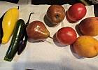 Zobaczcie moje zakupy z targu. Cukinie, bakłażany, pomidory, gruszki, brzoskwinie. Fasolka szparagowa została, bo byłoby za dużo. Ale będzie wyżerka. Za tydzień pojadę na inny targ, zobaczymy co tam mają.