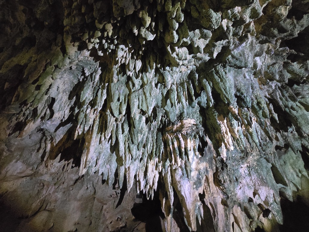 Tutaj jaskinia była ścisła, w wielu miejscach musieliśmy się kulić i pochylać głowy. I była rewelacyjnie oświetlona, tak, że światło nie raziło aparatu, jak zazwyczaj. Zdjęcia wychodziły dużo ładniejsze Ale też przy wsparciu latarki przewodniczki dawało złudzenie innych kolorów. A tam był jedynie zielony, od mchu porastającego formacje skalne.