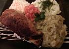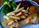 Podudzia z kurczaka pieczone,frytki z piekarnika,brokuł,surówka z kiszonej czerwonej kapusty.