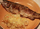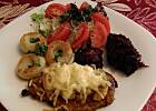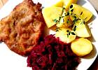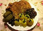 Wczoraj schab pieczony z sosem cebulowo-jabłkowym, kaczka nadziewana wątróbką i jabłkami, kluski śląskie, czerwona kapusta duszona z rodzynkami. Dziś to samo mięso i kapusta, ale z ziemniakami.