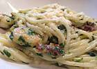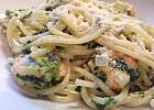 Spaghetti z krewetkami, szpinakiem i suszonymi pomidorami.