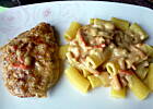 U nas dziś pierś z kurczaka w czerwonym sosie podana z makaronem i sałatą lodową.