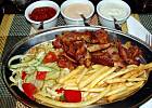 Kąski z karkówki z patelni (z cebulką) frytki, surówka z pomidora,cebuli i ogórka...Trzy sosy...tysiąc wysp, czosnkowy i barbecue...:)