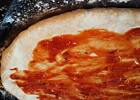 Musze dorobic drugie zdjecie z opisem pieczenia: piekarnik nagrzewamy do 250 stopni C, razem z blacha "do gory dnem" na prawie najnizszym poziomie piekarnika, przed zsunieciem pizzy na blache, piekarnik spryskujemy woda. :) jesli robie 4 pizze z 500 g maki, pieke ok 12 minut.