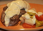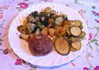 Tak sobie wymyśliłam i na myśleniu się skończyło... ;), ponieważ sarnę udawała pierś indyka w sosie własnym, zamiast batatów wystąpiły nasze polskie ziemniaki, a w rolę warzyw wcieliły się marynowane grzybki, własnoręcznie zbierane przeze mnie :))).
