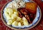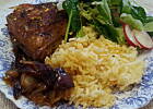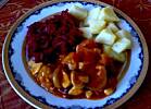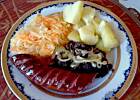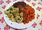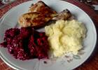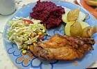 Niedzielnie: królik pieczony z cebulką, ziemniaki, buraczki i pekinka z różnościami.