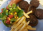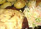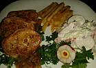 Kotlety mielone pieczone z ziołami nadziewane serem Brie, ziemniaki opiekane z koperkiem, sałatka szwedzka :)