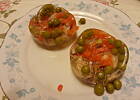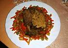 Plastry schabu obsypane przyprawą do mięsa wieprzowego,ułożone w naczyniu żaroodpornym,poprzekładane cebulą ,posmarowałam z wierzchu odrobiną majonezu wymieszanego z musztardą i upiekłam w piekarniku.