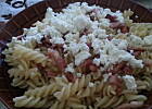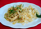 Kalarepka duszona w sosie śmietanowym podana z makaronem.