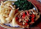 Dzisiaj do wyboru rybka,frytki,szpinak lub spaghetti z pieczarkami,papryka i czosnkiem albo spaghetti ze szpinakiem.