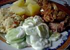 Wątróbka drobiowa z cebulką,ziemniaki,mizeria,surówka z białej kapusty.