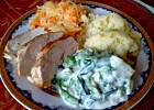 Młode ziemniaki z koprem,karczek zapiekany z cebulą i serem . surówka z młodej kapusty ze smietanką