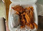 To reszta z obiadu mojego brata. To zabrał do domu, zjadł drugie tyle, była jeszcze surówka oraz hashpuppies (to kulki zazwyczaj, tu były w kształcie rolek, z ciasta z mąki kukurydzianej i zwykłej z cebulą, usmazone w głębokim tłuszczu), te zostały w restauracji, bo zimne albo odgrzane smakują okropnie. To był obiad za 20 dolarów (za tą ilość w przeliczeniu to mój brat mówił, że nie było drogo). A ta kwota to jak w Polsce 20 zlotych, w stosunku do zarobków. Nasza porcja składała się z dwóch filetów z suma plus surówka, frytki lub purre (moje) i wspomniane hashpuppies i taki obiad kosztował 13 dolarów.