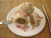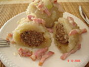 Sorry,ze odgrzebuję ten wątek, ale jest bardzo cenny, a cepeliny/kartacze są tego godne.Ja zafascynowałam się nimi na Litwie. Potem znalazłam przepis i w procesie wielu prób(i błędów)) też robię podobną metodą zaparzanego ciasta.Podpatrzyłam na Litwie, że oni przed nadzianiem(koniecznie mięso wołowo-wieprzowe z dużą zawartością majeranku, czosnku i mielonego kminku) formują mięso w wałeczki- w środku kartacza jest wałeczek mięsa. Wspaniale wyglądają, jak sie je przekroi.Ja je zawsze podaję-zgodnie z oryginałem ze skwarkami z cebulą + obok gęsta śmietana.
