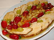 1,2 kg filetów z piersi indyka, 1 puszka ananasów, 1 puszka brzoskwiń, 5 dkg ciemnego winogrona, 5 wisienek, 1/2 szkl. rosołu instant, 3 łyżeczki żelatyny, po szczypcie suszonej mięt, szałwi, bazyli, sól i pieprz.Mięso natrzeć ziołami, solą i pieprzem. Ułożyć w naczyniu i piec 40 min w temp.200 stopni. Rosół wymieszać z 1/2 szklanki soku z brzoskwiń plus 1/2 szklanki soku z ananasa i podlewać mięso w czasie pieczenia. Sos z pieczenia plus soki i woda razem 2 szklanki plus żelatyna wymieszać.
