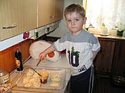 Sliczny chlopczyk a jaki pomocny:-) widac ze zdolnosci kulinarne ma po babci:-)