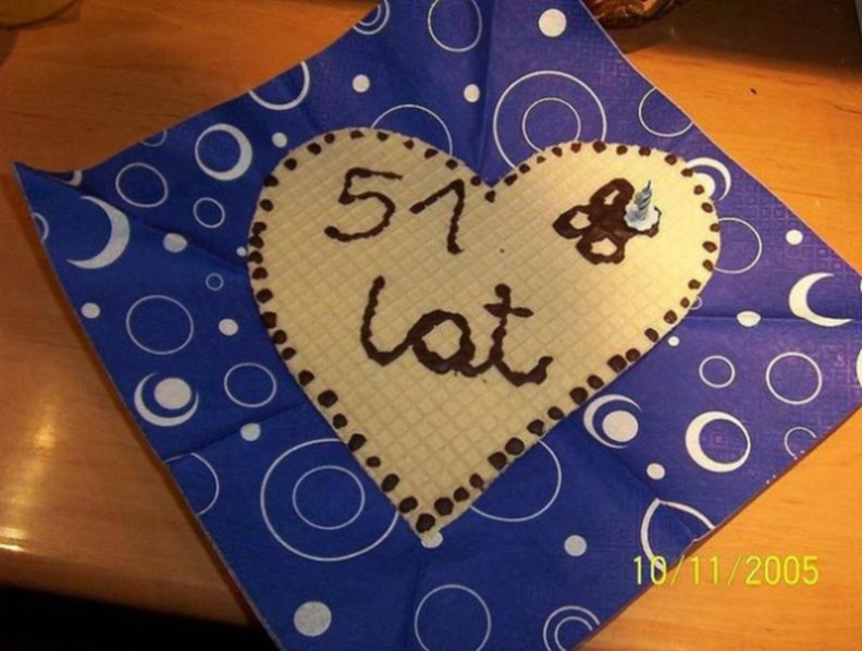 Witam od niedawna jestem stałą bywalczynią WŻ. Chciałabym podzielić się z Wami moim pomysłem. Pewnego dnia zostałam zaskoczona wizytą mojej rodzinki. Tego dnia kuzyn obchodził swoje 51 urodziny. Nie było czasu na kupno, a tym bardziej na wypieki, więc szybciutko wymyśliłam ten ,,tort". Zaskoczenie było wielkie i śmiechu co nie miara. Pozdrawiam Wszystkich, a w szczególności kuzyna Kazika
