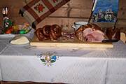 jedzienia nie do przejedzenia,stoły uginaja sie pod ciężarem jadła, nic przócz chleba nie zostalo kupione w sklepie, wszystkie wyroby przygotowane zostaly przez naszych gospodarzy: począwszy od świeżego ,pachnącego słodziutkiego mleczka prosto od krówki , kwaśnego mleka owczego , poprzez szynki kielbasy, smalec,krupnioki, salceson,kwasnicę ! pycha!, Jedzenie nie jest wydzielone, absolutnie nie, jesz ile dusza zapragnie . zobaczcie sami :