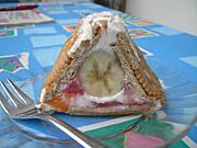 Na to krem, ja dawalam krem z serka homogenizowanego z wanilia, cukrem, (wlasciwie to co kto chce) na ten krem dojrzaly banan,