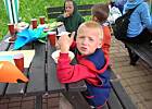 Wszyscy wznosili toast z soku z marchewek a chrzestnymi rodzicami byli... oczywiście oficjele samorządowi i jak zwykle nawet w dzień wolny od pracy nie mogłam się od pracy uwolnić. Potem dzieci wraz z rodzicami mogli przystapić do biegu, zadań do wukonania było mnóstwo.Niestyty pokaże tylko kilka, kiedy mój Mały mógł je wykonać sam.Te które wykonywaliśmy wspólnie niestety nie zobaczycie ( fotograf miał zajete ręce). Na początek puzzle po ułożeniu trzeba było odwrócić i nauczyć sie wierszyka który był po drugiej stronie układanki, Nastepnie trezba było wykazać sie umiejętnościami w..... wędkowaniu. Ale za to na końcu wędki zawsze coś sie znalazło. Mały wyłowił koło do pływania.Potem podreptaliśmy dalej a tam konik i zadanie anatomiczne. w nagrodę otrzymał Gwasza - taka moneta którąpotem można było wymienić.No i marchewke dla konia. Oczywiście kubełek Gruzji zapełnił się marchewkami. po koniku ruszyliśmy szukać skarbu.. jak to Fort ma swoje tajemnice ... ale w środku, w ciemnościach piwnicznych na dzielnych zdobywców czekały .... wory złota. Były również inne zadania sprawnościowe Mały uczył się wyznaczać azymut Mama musiała zorientować mapę, również zbudować totem w stosie wzorów wybralismy indyka, zebraliśmy niezbędne naszym zdaniem krązki, gałażki itp i zabraliśmy sie do roboty. A oto efekt naszej pracy Był tor przeszkód, Mały musiał wykonać slalom taczkami, wyczyścić ponton z piasku no i oczywiście uzupełnić w 2 minuty wybudowany już zamek z piasku. Na zmęczonych budowniczych czekała zupka ale też i nowe zadanie Mały dzielnie smarował bo przecież na stole obok czekały....... no i dla odpoczynku mała przejażdzka na Sokole prowadzonym przez moją Starszą latorośl, która niestety nie mogła bawić się z nami ale również była w swoim zywiole .