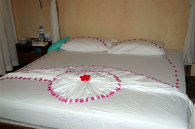 A zwalaj się (hi,hi) zwalaj! Tylko ciut daleko z Bawarii do mnie , ale chyba czasem przyjeżdżasz do Polski? Ja też czasami przjeżdżam przez Bawarię, ale rzadko. A kuchnię może i widziałaś, choć wątpię, one wszystkie są do siebie podobne... To jest w Tailandii na wyspie Ko Samui..... super wakacje były.....i Glumandy też były! A małżonek gdzie może robi kursy gotowania i pobiera nauki, nawet na wakacjach!!! Ale dla Ciebie mam fotkę Twoich kuzynek z Maledivów : a taki widok był przed moim bungaloo : No i na koniec nasze łóżeczko udegorowane kuzynką : Fajne co? Ja tam mogę mieć takie codziennie, nie tylko na wakacjach!