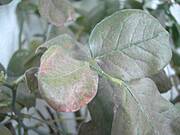 Objawy: na młodych liściach pojawia się biały, mączysty nalot porażone liście ulegają deformacji, ich brzegi lekko się zawijają, zwykle po kilkunastu dniach nalot zmienia zabarwienie z białego na szary, objawy w postaci plam mogą być widoczne również na pędach, szypułkach i płatkach kwiatowych,