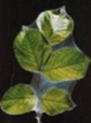 Przyczyna: larwy i osobniki dorosłe przędziorka chmielowca, drobnego roztocza o 8-miu odnóżach, długości nie przekraczającej 1 mm i barwie od żółtawo-zielonej do czerwono-pomarańczowej, żerującego od maja do sierpnia na dolnej stronie liści, może się zdażyć że liście zostaną osnute cienką pajęczyną (na fot.),